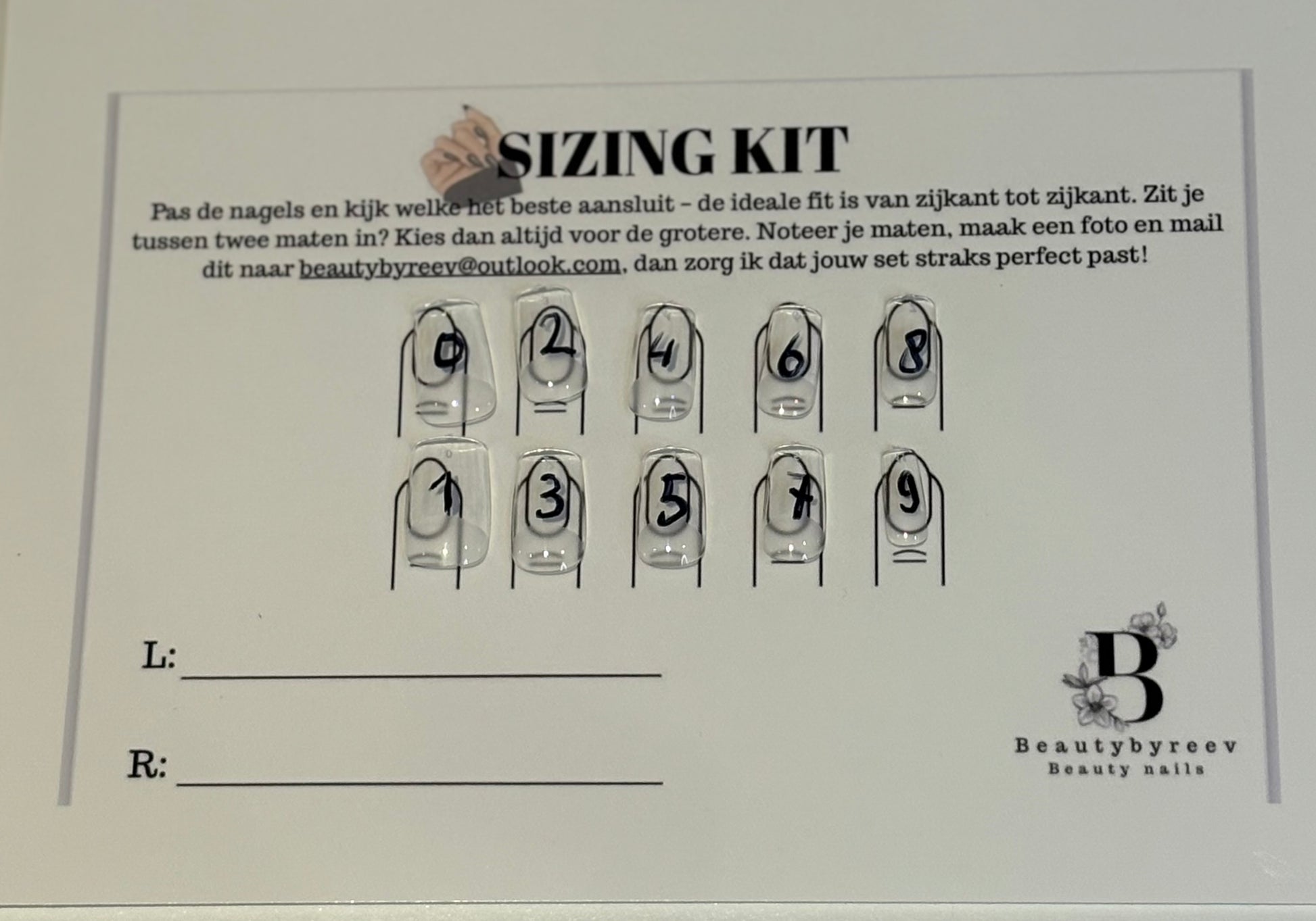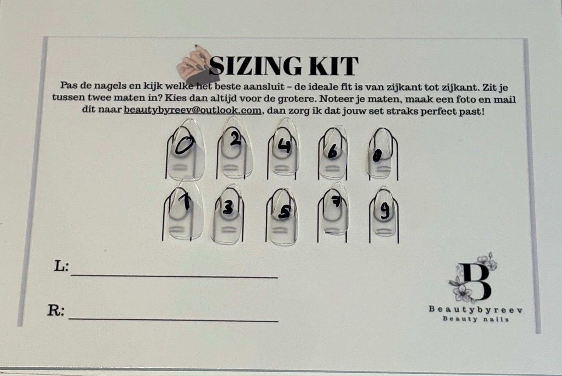 - 10 maten nagels per hand (maat 0 t/m 9)